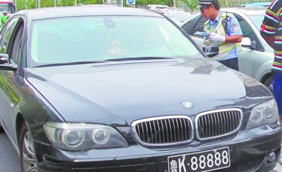 ????14日下午3時許,市南交警大隊寧夏路中隊套牌假牌緝查小組的民警在巡邏至福州南路時,發現一輛黑色寶馬轎車情況可疑,隨即將其攔下進行檢查。這輛黑色轎車是寶馬750Li,新車市場價值超過200萬元,而其懸掛的“魯K88888”黑色號牌看上去似乎比這輛寶馬轎車還要搶眼。可這幅車牌并不屬于這輛寶馬轎車。民警發現,該車沒有懸掛后車牌,而前車牌輕輕一拉就取了下來。經過數據庫信息對比后發現,號牌為“魯K88888”的車輛是一輛威海的奔馳轎車,顯然與眼前的這輛寶馬對不上號,該車系套牌車輛。