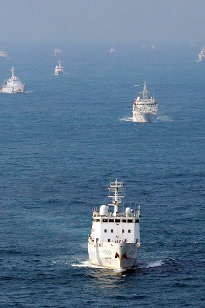 9月18日,共有包括中國海監及漁政在內的12艘公務船相繼進入釣魚島附近海域;19日上午,又新增一艘中方公務船。至此,中方在釣魚島附近海域巡航的公務船只已達到14艘,其規模前所未有。圖為航拍照片,展示了中國海監船、漁政船和日本海上保安廳的巡邏艦(右一和左二)。