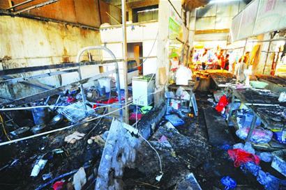 記者看到,這個肉食區(qū)由三間大房子組成,共約120平方米。據(jù)市場的一名攤主介紹,這個肉食區(qū)內共有五個賣生豬肉的攤位。在這三間房子旁邊,是一個賣豬頭肉的門店,面積約30平方米,一堵由纖維板制作的“臨時墻”將它與肉食區(qū)隔開,但在大火中,這堵“臨時墻”被燒得殘缺不全,將肉食區(qū)跟這個豬頭肉店串通起來。據(jù)介紹,最先起火的地方就是這個豬頭肉店。