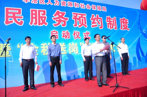 活動首先進(jìn)行了啟動儀式,區(qū)委常委、區(qū)政府常務(wù)副區(qū)長張?jiān)⑶鄭u市人力資源和社會保障局副局長劉衛(wèi)國分別進(jìn)行講話,對李滄區(qū)人力資源社會保障便民服務(wù)制度給予了充分肯定,提出了更高的期望和要求。活動中,還對便民服務(wù)隊(duì)進(jìn)行了授旗儀式,向服務(wù)對象代表發(fā)放預(yù)約服務(wù)聯(lián)系卡。