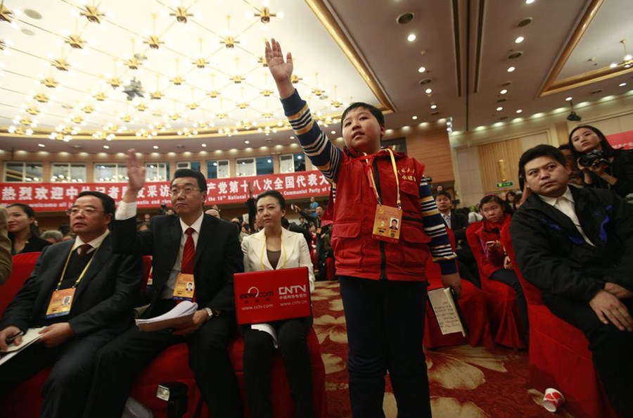 11月11日,十八大新聞中心,中國少年報的小記者跑新聞發布會,他們要報道開閉幕會,聽小組討論等。小記者張佳鶴舉手提問。