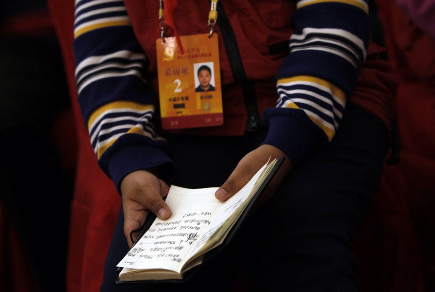 11月11日,十八大新聞中心,中國少年報的小記者跑新聞發布會,他們要報道開閉幕會,聽小組討論等。小記者的筆記本上記滿筆記。