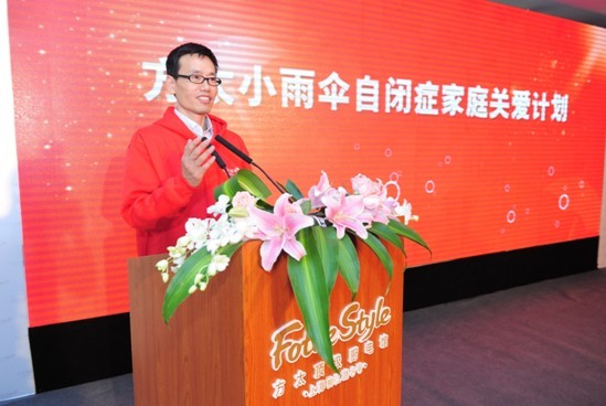 ????著名心理學家夏東豪老師致辭? ????作為中國廚電的領導品牌,寧波方太集團不只為客戶提供最好的產品和服務,更通過慈善行動、教育與文化、環保行動、社區活動來持續促進社會和諧發展。從2007年至今,方太先后成立慈善基金、興建養老院、組織慈善義演、向地震災區捐款……方太致力于“讓家的感覺更美好”,家庭的健康才能成就社會的美好,而自閉癥家庭作為千千萬萬社會家庭的組成部分,其幸福與美好更加牽動著方太集團每位公益事業推進者的心。上海第一財經傳媒有限公司以及旗下《第一財經周刊》隸屬于上海東方傳媒集團有限公司,其媒體視角立足商業前沿,關注各項商業領域的創新,而企業社會責任的新嘗試、新拓展更是商業創新領域不可或缺的一部分。此次與方太集團攜手共同推出針對自閉癥家庭的關愛計劃,意味著企業社會責任行動與媒體社會責任視野相結合,從社會傳播的角度將關愛行動擴展到最大化的真正實踐。“2012方太小雨傘自閉癥家庭關愛計劃”從2012年11月11日正式啟動,將歷時約6個月,期間以“快樂廚房”、“快樂運動”、“戶外拓展”三個項目為自閉癥家庭帶去形式豐富的互動活動。繼今天的新聞發布會暨關愛計劃啟動儀式之后,“快樂廚房”將是此次計劃的第一個具體項目,其形式在于通過方太的廚房料理課程幫助家長從生活中獲取歡樂,并鼓勵自閉癥孩子多多參與,增進其與父母的互動,從而實現讓自閉癥孩子突破思想、行為障礙,從小小的廚房料理中懂得互助、關懷與愛,更深入地感受到家庭的幸福感;而隨后的“快樂運動”將邀請到上海男籃的職業運動員帶領家長與孩子參與籃球比賽,讓他們在運動中達成默契,在運動中尋找歡樂,在運動中獲得身心健康,并給獲勝家庭頒獎;“戶外拓展”項目將在春天來臨之際,由方太集團組織自閉癥家庭前往上海東方綠洲踏青,邀請專業戶外風箏達人教孩子學做風箏,并在父母的帶領下給風箏畫上美麗的圖畫,而圖畫所寄托的美好期望也將隨著風箏共同放飛到藍天與陽光之中。