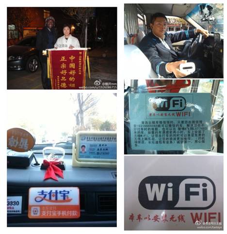 島城現(xiàn)潮的哥,自費(fèi)開WiFi方便乘客。近日,交運(yùn)出租的王向輝@飛翔LUT7483 師傅自費(fèi)開通WiFi無線網(wǎng)絡(luò),讓乘客在打車時(shí)免費(fèi)無線上網(wǎng)。此外,王師傅還提供微博、微信約車,下一步他也將像@飛揚(yáng)的紅飄帶 一樣開通支付寶手機(jī)付款。