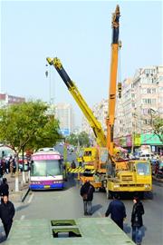 昨天上午10時,兩輛大型吊車和一輛大型拖車來到現場。“我們測量了一下,這輛大客車長12米,一輛吊車吊不起來,普通拖車還放不下,只好弄來了三個‘大家伙’。”現場負責吊車的某公司負責人告訴記者,他們的拖車長度超過了20米,拖兩輛坦克都沒問題,公司還專門特制了工具來固定大客車。