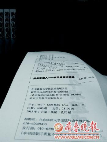 ????4日,記者來(lái)到書(shū)城,在四樓的武術(shù)類書(shū)籍里找到了這本書(shū)。記者注意到,書(shū)的內(nèi)頁(yè)的確寫(xiě)著首次印刷日期在2013年,印數(shù)為4000冊(cè),定價(jià)為23元。對(duì)此,書(shū)城的工作人員解釋稱,這本書(shū)是出版社統(tǒng)一發(fā)的貨,絕對(duì)是正版,不會(huì)有質(zhì)量問(wèn)題?!翱赡苁切枰@本書(shū)的讀者太多,出版方在年底之前就出版了,這種情況很正常?!睍?shū)城的工作人員稱。