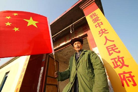 12月10日,山東東營,東城沙營村六旬軍屬老人紀慶玉在自家門前手舉五星紅旗。12月1日,紀慶玉老人的兒子響應國家號召報名參軍,應征入伍后考上了軍校,被留在東海艦隊服役,只留他和患病二十多年的殘疾老伴在家過日子。多年來,他日子雖然清苦,但也過得去。今年3月,紀慶玉老人的房屋前開始了大規模拆遷。梁效/東方IC