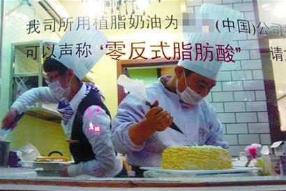 ????記者來到人民路上的一家面包房。“師傅,你們這用的是什么奶油啊。”記者詢問說。“面包用的奶油比蛋糕少,就這點我們必須是用最好的奶油啊。”店主回復說。在之后的談話過程中記者了解到,該面包房店主對植物奶油和動物奶油的劃分并無明確的概念,店里使用的奶油統統為植物奶油,而店主認為植物奶油為純天然奶油,比其他奶油都要更健康一些,甚至在醒目的位置打出“零反式脂肪酸”的廣告語,可記者在后來采訪營養專家時了解到,植物奶油要做到“零反式脂肪酸”幾乎是不可能的。