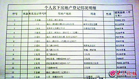 網(wǎng)上曝出的"房爺"于保成房產(chǎn)明細(xì)。