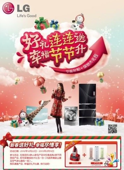 ????好禮連連送 幸福節(jié)節(jié)升!LG年末促銷狂歡盛裝登場。即日(12.22)起至2013年2月15日,只要購買LG部分型號的洗衣機(jī)、冰箱或3D電視產(chǎn)品中的任意兩款不同類別的產(chǎn)品,即可獲贈包含床褥吸塵器及空氣凈化器各一部的繽紛大禮包。另外,購買符合國家一級節(jié)能標(biāo)準(zhǔn)的LG冰洗產(chǎn)品,還能最多享受800元的現(xiàn)金優(yōu)惠! ????驚喜一:LG超大容量滾筒洗衣機(jī) 新春掃除好幫手