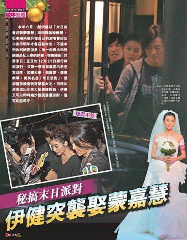 ????據(jù)最新一期香港《3周刊》報(bào)道,今年6月,鄭伊健以“末日前會(huì)迎娶蒙嘉慧”來(lái)回應(yīng)結(jié)婚傳聞,但事隔兩個(gè)月在自己的演唱會(huì)卻反口表示明年才會(huì)迎娶女友。不過(guò)周刊記者收到絕密消息,指一向表示拍拖結(jié)婚是私事的伊健,在被傳是“世界末日”正日的12月21日舉行神秘派對(duì),只限一眾非常親密的老朋友出席,如謝天華、錢(qián)國(guó)偉、錢(qián)嘉樂(lè)等,美其名曰“末日派對(duì)”,但卻極有機(jī)會(huì)玩突襲娶女友,同時(shí)如消息流出引來(lái)大批傳媒采訪(fǎng),伊健又可以即時(shí)變回普通派對(duì),進(jìn)可攻退可守。