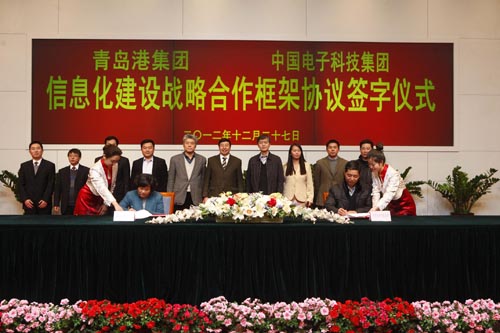 ??? 本報訊 12月27日,青島港與中國電子科技集團信息化建設戰略合作框架協議簽約儀式在青島港集團國際會議中心隆重舉行。青島港集團董事局主席、總裁常德傳以及中國電子科技集團遠東國際貿易公司總經理黃國強、中國電子科技集團十四所黨委書記郁蔚銘等領導出席簽字儀式。