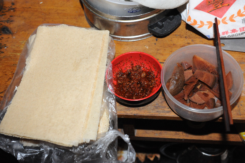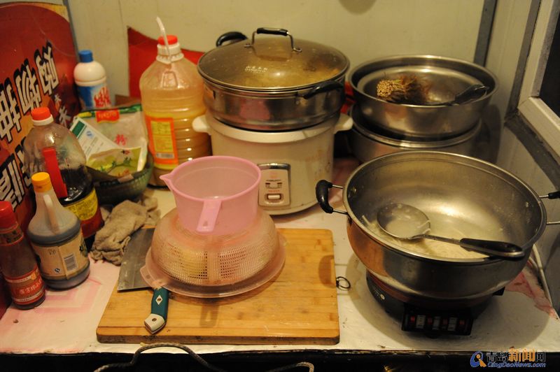 ????用木板簡易搭起來的廚房,兩個鍋、一張菜板、一把刀、幾瓶調味品。整個廚房不足一平米。