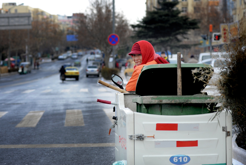 ???? 環衛工李季花等待信號燈時,回頭露出了燦爛的笑容。