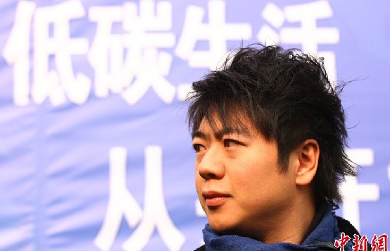 1月12日下午,頭頂綠帽、別著“好人”標牌,陳光標在江蘇南京向民眾免費發放千輛自行車。中國著名鋼琴家郎朗也來到現場,他彈奏了一曲鋼琴曲,稱自己在2008年也開始做公益活動,并將把500張南京演出票捐給觀眾。陳光標是大陸頗受爭議的慈善家,其“高調”行善方式長期以來惹人關注。圖為郎朗。(泱波 攝)