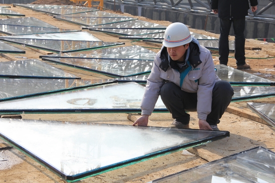 在鋼結構完成封頂的同時,記者看到,植物館玻璃幕墻的拼嵌工作已經在同步進行當中。在植物館西北側的穹窿位置,已經拼嵌好部分玻璃幕墻,每塊玻璃都呈三角形,在陽光的照射下閃爍著琉璃般的光彩。可以想象,當整個植物館15000多塊玻璃幕墻拼嵌完畢,呈現在世人眼前的植物館,將如一座水晶殿堂一般閃亮剔透。