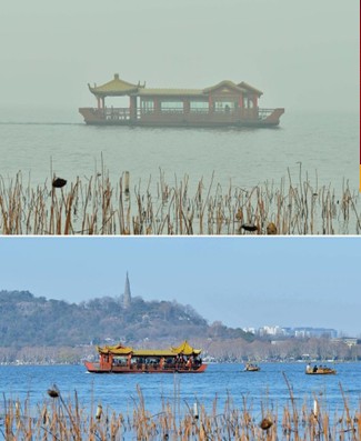 上圖:1月28日,杭州西湖游船在霧中行駛;下圖:1月1日拍攝的晴朗天氣下的杭州西湖。(新華社發)