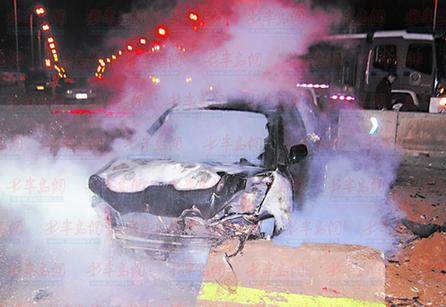 ????“一開始撞上時并未起火,大約過了10分鐘,車子的引擎蓋才開始冒出濃煙和火苗!”最先發現起火的一名的哥告訴記者,當晚11時30分,他正在附近送客人,目睹了車禍現場,大約10分鐘后他再次返回現場時,事故車已經開始燃起火苗,他趕緊將出租車停下并拿出隨車攜帶的滅火器沖到車前滅火。幸虧消防隊員來得及時,要不然引爆了油箱也是很危險的。采訪時,記者并未在現場找到事故車的司機。消防隊員告訴記者,他們也沒看到司機和其親友。