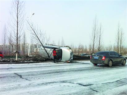 記者看到,由于道路太滑,一輛白色商務車開到了綠化帶里,車頭的保險杠都已經破碎脫落了。不遠處,另外一輛黑色轎車則一頭扎到了路邊的路基石上。 5個人在一邊焦急地打著電話。剛往前走了不到50米,記者又看到了一起3車連撞的交通事故。在不到200米的距離,記者就看到了4起因為路面濕滑導致的交通事故。(記者 田 璐)
