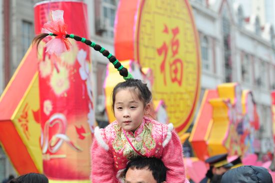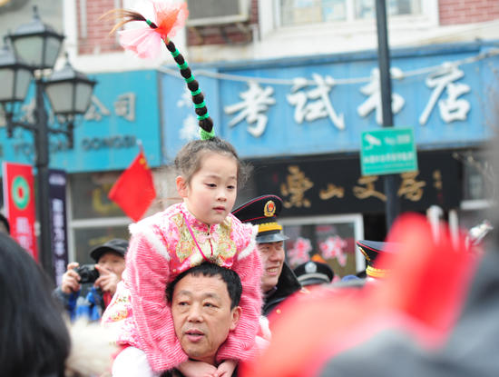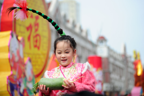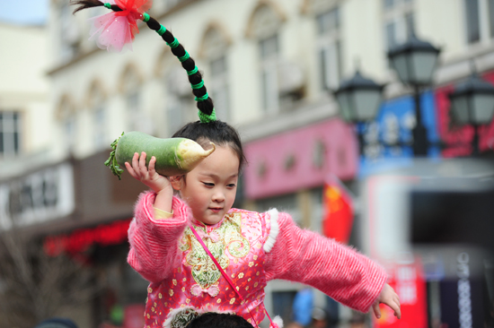 上午10點,會場上已經(jīng)是人山人海,水泄不通,在擁擠的人群中一個打扮俏麗,頭扎30多厘米長的翹天辮的“小蘿莉”吸引了眾多攝影愛好者的目光?!伴L槍短炮”將她團(tuán)團(tuán)包圍。小姑娘手捧蘿卜,身上穿著喜慶的粉紅色唐裝,坐在一位老者的肩頭。面對鏡頭,小姑娘絲毫沒有羞澀膽怯,每當(dāng)有人喊她看鏡頭時,她都會主動露出笑臉,并將手中的蘿卜舉起來,極具“明星范”。
