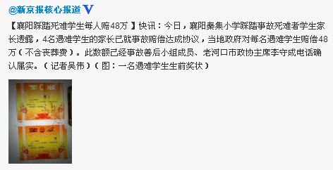 【襄陽踩踏死難學生每人賠48萬】快訊:今日,襄陽秦集小學踩踏事故死難者學生家長透露,4名遇難學生的家長已就事故賠償達成協議,當地政府對每名遇難學生賠償48萬(不含喪葬費)。此數額己經事故善后小組成員、老河口市政協主席李守成電話確認屬實。(記者 吳偉)