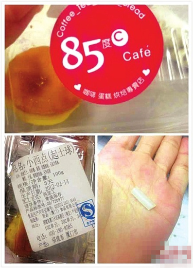 ??? 投訴:2月24日下午,白領彭小姐到85度C石牌橋分店買了兩塊面包和一盒六個裝的起士球,總共花費24元。“小朋友吃完一個起士球后拿了第二個吃,誰知咬了一口就發現里面夾有一小塊管狀異物。”彭小姐說,小孩吐出一口起士球,里面有一個長約3厘米,呈半透明狀的異物,很像塑料管。“因為完全夾在起士球中間,所以沒咬開前完全看不出來。”彭小姐說,小朋友看到異物后當即覺得惡心,幾個大人也因此倒了胃口。彭小姐希望,面包店能給出說法,并且多注意生產衛生。