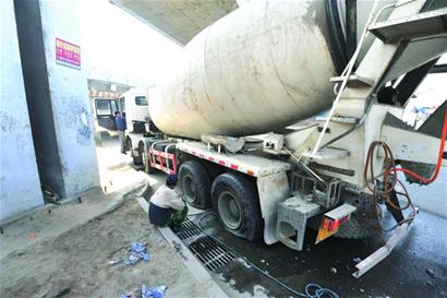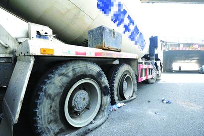 記者繞到車身后看見,攪拌罐下方的八個(gè)承重輪已經(jīng)全癟了,一輛載著氣泵的面包車正停在車后方給輪胎加氣。“要不是我把氣放掉,車根本沒法開出來!”司機(jī)抹了一把額頭上的汗,向記者講述了昨晨的一幕。