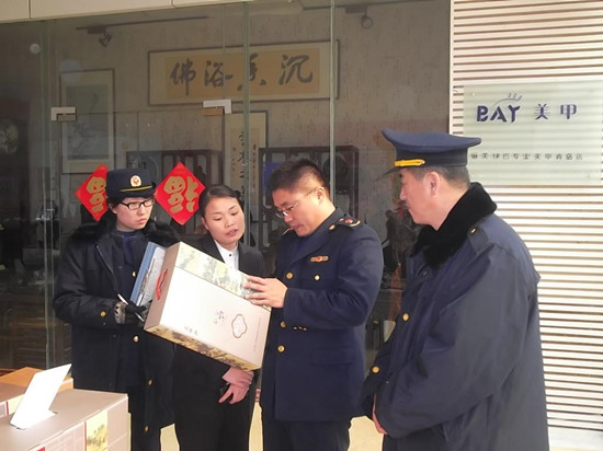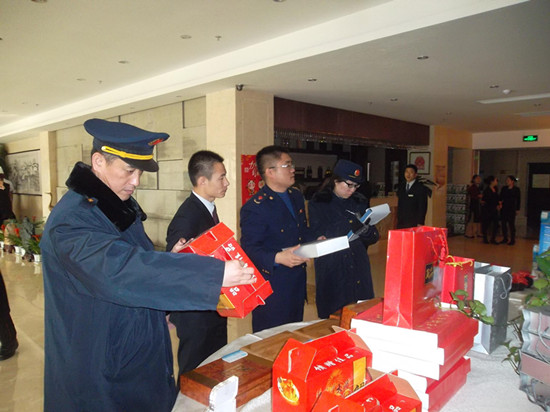????根據近年來大型酒店臨近節日銷售高檔食品禮盒的實際情況,為確保監管不留死角,長江路工商所對轄區內藍海金港大飯店、多元錦江大酒店、海都大酒店、長新酒店等大型酒店展開拉網式排查,對所銷售年貨食品進行檢查。在檢查中,執法人員檢查了經營者對所