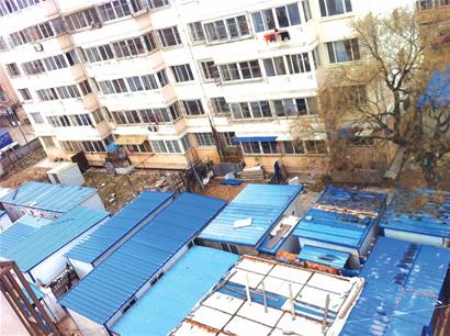 小區(qū)內,這樣簡易的搭建大多存在于居民樓一樓的窗下,一米見方的雜物堆兒,在每個單元門口幾乎都有一兩個。更多的是“排列整齊”的活動板房,把路邊綠化帶直接占滿,從小區(qū)東頭一字排到西頭。多數(shù)活動板房門前都用油漆噴涂著 “車庫門前請勿停車”的字樣,如果是不明真相的市民經過,可能會認為這是小區(qū)統(tǒng)一布局的車庫。