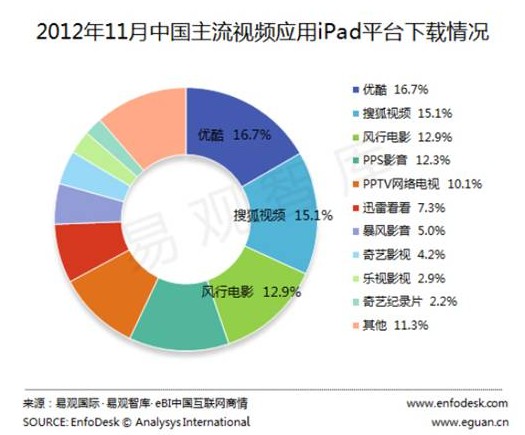 ????近幾年隨著移動互聯網的風生水起以及手機、 Pad 等移動終端的飛速“進化”,視頻行業也在向移動化、大屏化進軍。與傳統互聯網略有不同的是, PC 時代搜索引擎導入、門戶引流等用戶行為在移動端將被極大弱化,在移動互聯網領域誰擁有更多的客戶端裝機量,就意味著擁有更多的流量。擁有了穩定流量,就會考慮變現,這是互聯網的一貫商業邏輯。在視頻網站眼里,移動端流量變現的規模底線已經開始浮現。 ????易觀智庫對 2012 年 11 月中國主流視頻應用 iPad 平臺下載量的檢測報告顯示,風行網 iPad 客戶端下載量高居前三名。此次易觀監測數據顯示,優酷、搜狐視頻、風行電影三個客戶端位列 2012 年 11 月 iPad 平臺視頻應用客戶端下載量前三位,與位列其后的 PPS 影音和 PPTV 網絡電視一起,五個應用共占據前十位下載總量的 67% ,優勢明顯。此外,迅雷看看、暴風影音、奇藝影視、樂視影視、奇藝紀錄片分列 iPad 主流視頻應用下載量的第六至第十位,五個應用共占 21.5% 的份額占比,而其他視頻應用客戶端在 iPad 平臺的下載量僅占 11.3% 的份額占比,市場競爭激烈。 ????除了在 Pad 端的大舉發力外,目前視頻行業對于整個移動端都給予了更多的投入。 2012 年我國網絡視頻用戶已達 4.5 億,在全國網民總數占比超過 70%; 手機視頻用戶超過 1 億戶。全球智能手機用戶超過 10 億,滲透率超過 15% ,而中國大陸 2012 年智能手機銷量將增長 137% 達到 1.89 億部。可以想象, 2013 年手機視頻用戶將超過 PC 端。這一趨勢推動下,提前布局的視頻網站來自移動終端的流量在今年將得到更迅猛的增長,相應的,移動視頻商業化也將實現。易觀分析師指出,移動視頻的發展正在遵循桌面視頻的軌跡,其發展速度更快,未來,移動視頻將成為移動互聯網眾多領域中商業變現能力最強的領域之一。