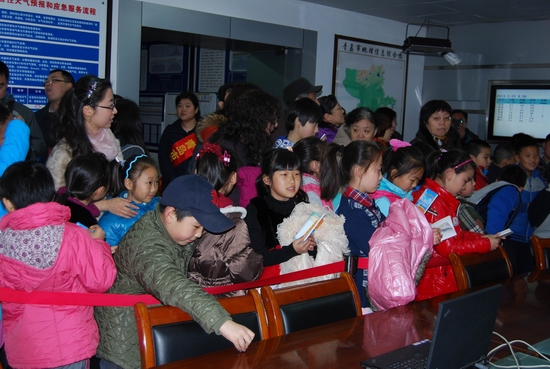 眾多家長(zhǎng)帶著孩子參觀氣象臺(tái)學(xué)習(xí)氣象知識(shí)