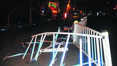 ????110民警和交警到場后將倒在車行道上的護欄移走,避免給過路車輛造成危險。 “還好他們來得快,這里晚上光線不大好,這些鐵家伙很容易卡住車底盤。 ”一名圍觀的哥介紹道。