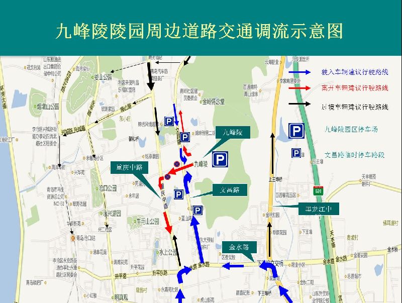若九峰陵停車場車輛停滿時,文昌路雙向單排停發車輛,九峰陵路禁止停放車輛。