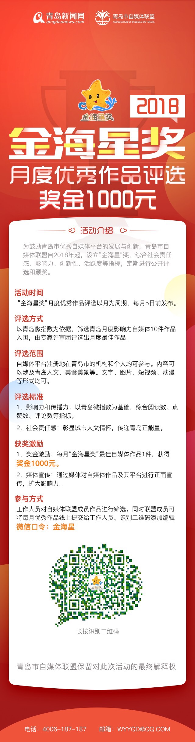 三、評選范圍:自媒體平臺注冊地在青島市的機構和個人均可參與。內容可以涉及青島人文、美食美景等。文字、圖片、短視頻、動漫等形式均可。