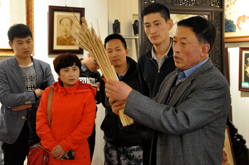 本次采風活動的第一站聯盟成員們來到了泊里鎮麥草畫展覽館。麥草畫始于隋唐時代的宮廷工藝品,是以麥秸稈為造型原料,運用麥稈的自然光澤和紋理、質地,創造性融入國畫、油畫、水粉畫、版畫、刻版書法等諸多技術技法,經過熏、蒸、漂、刮、推、燙、以及剪、刻、編、繪等多道工序,純手工制作而成。展覽館內陳列著各類麥草畫展品。花鳥畫、偉人像、江山圖等作品栩栩如生,讓聯盟成員們忍不住贊嘆。