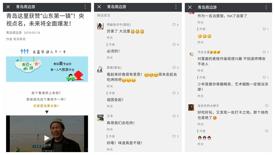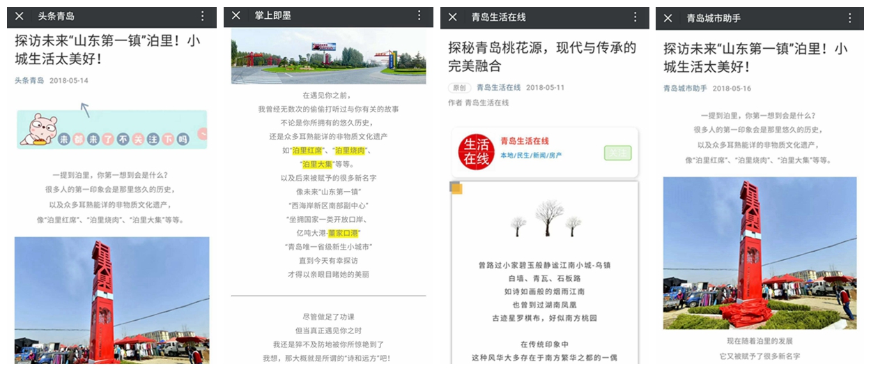 “青島周邊游”發(fā)布的“青島這里獲贊“山東第一鎮(zhèn)”!央視點(diǎn)名,未來將全面爆發(fā)!”從泊里大集為出發(fā)點(diǎn)介紹了泊里的麥草畫、紅席、泊里美食、美景等特色,吸引大批網(wǎng)友把泊里作為旅游目的地。