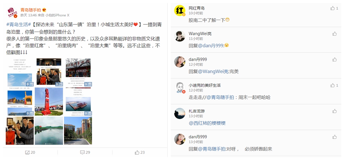 另外,青島本地知名資訊博主“青島隨手拍”在本次宣傳中也表現(xiàn)突出,其發(fā)布的“探訪未來山東第一鎮(zhèn)泊里!小城生活太美好”的博文累計(jì)閱讀10萬+,轉(zhuǎn)發(fā)20余次,評(píng)論29個(gè),點(diǎn)贊23個(gè),更有許多本地資訊博主像“網(wǎng)紅青島”、“青島同城”參與轉(zhuǎn)發(fā),引發(fā)很好的二次傳播。