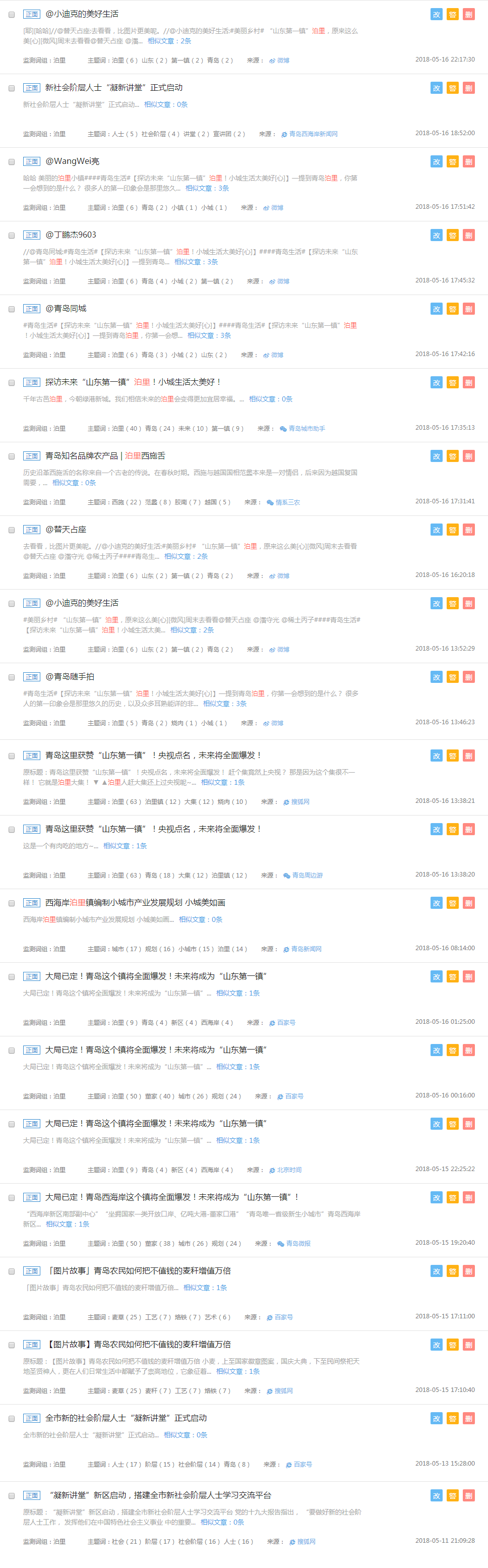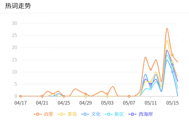 從熱詞走勢表中我們可以看到,5月11日前關(guān)于泊里的熱門詞匯一直處于0-5之間徘徊,5月11日之后,清博大數(shù)據(jù)后臺(tái)監(jiān)控到泊里、青島、文化、新區(qū)、西海岸等熱門詞匯呈爆發(fā)式遞增狀態(tài),尤其是5月14日當(dāng)天關(guān)于泊里的熱門詞匯更是接近30,充分體現(xiàn)出新媒體的傳播效果。