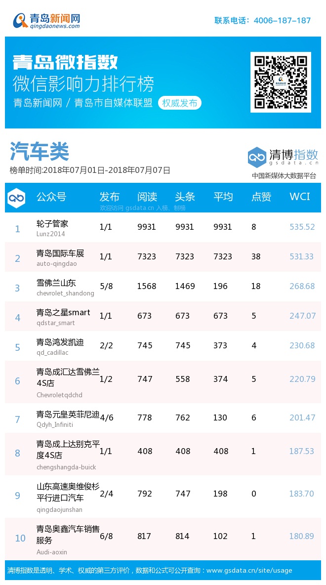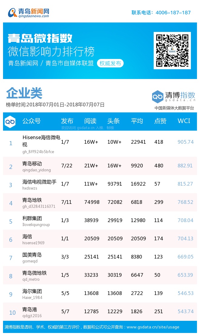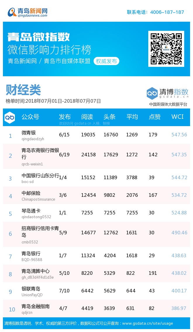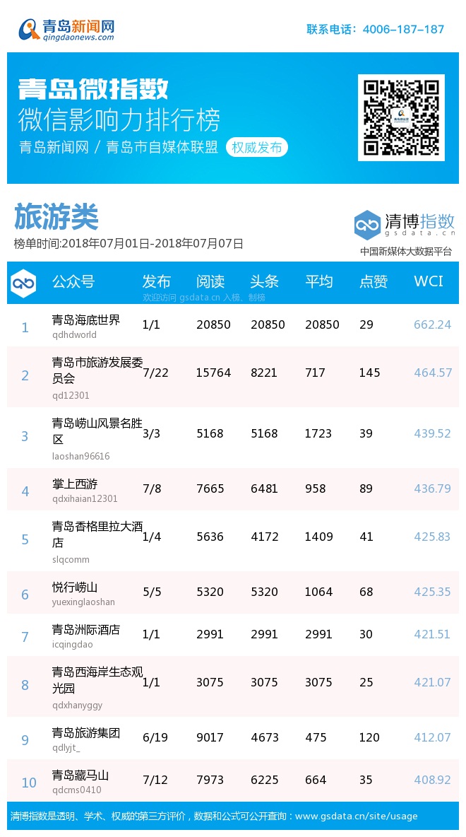 3、本次榜單收錄了青島14個行業微信公眾號,如您的賬號暫未收錄,可聯系4006-187-187。