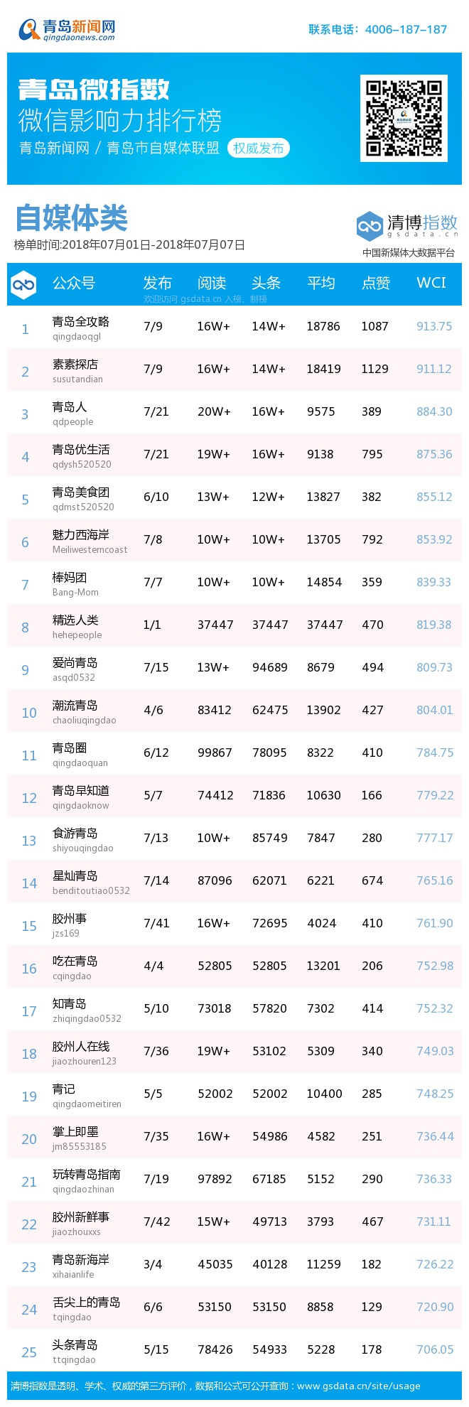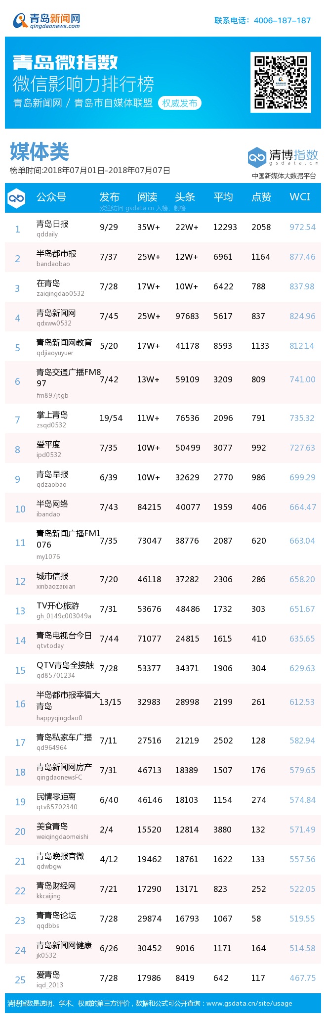 青島新聞網7月9日訊(記者 邢書玲)由青島新聞網、清博指數平臺聯手打造的“青島微指數微信影響力排行榜”今日發布一周(7.1—7.7)榜單。