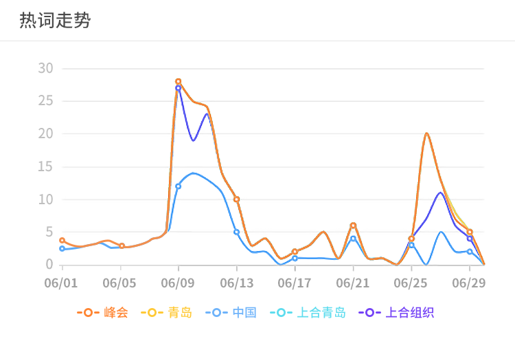 據(jù)熱詞走勢表顯示,在6月9號之前,關(guān)于峰會(huì)的熱門詞匯一直在0-5之間徘徊,6月9日之后,各端齊發(fā)力,紛紛發(fā)出關(guān)于峰會(huì)的最新報(bào)道,關(guān)于峰會(huì)、青島、上合青島、上合組織等熱門詞匯呈爆發(fā)式遞增,尤其是9號、10號這兩天,熱詞走勢更是接近30的峰值。