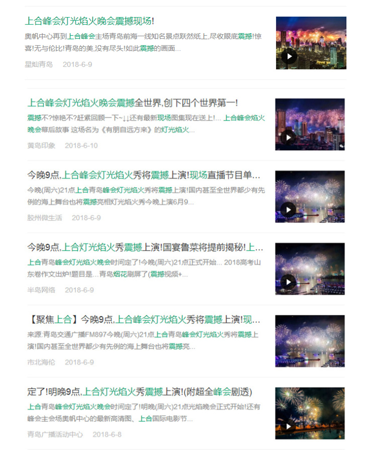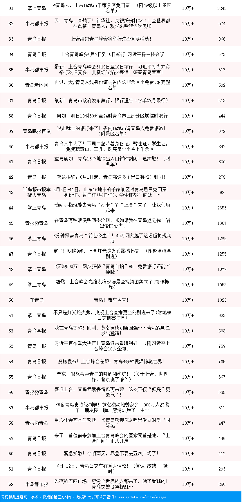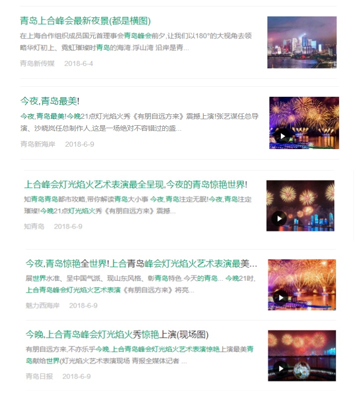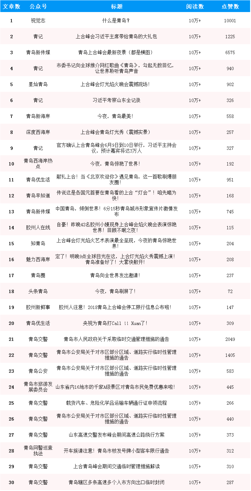 其中,在上合青島峰會(huì)宣傳報(bào)道中,青島各大微信公號關(guān)于峰會(huì)的報(bào)道起到了很好的配合,據(jù)統(tǒng)計(jì),峰會(huì)期間,關(guān)于峰會(huì)的超10萬+爆文共計(jì)62篇,在朋友圈達(dá)到了刷屏的效果。
