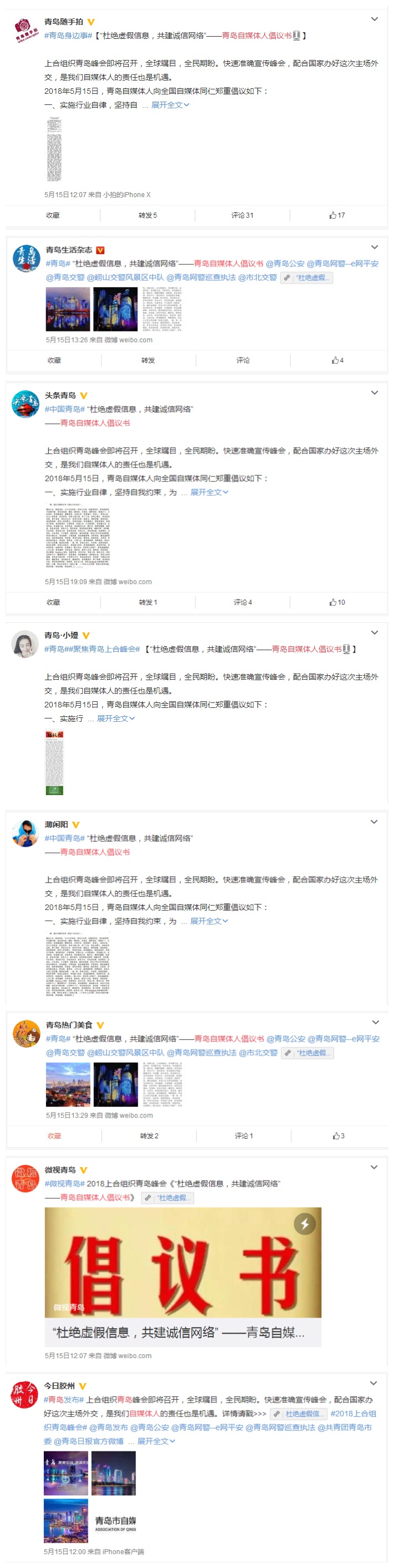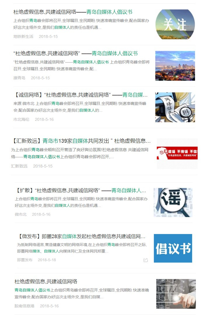 為保障上合組織青島峰會(huì)順利召開,5月15日青島市自媒體聯(lián)盟組織聯(lián)盟成員聯(lián)合發(fā)布“杜絕虛假信息,共建誠信網(wǎng)絡(luò)——青島自媒體人倡議書”,得到聯(lián)盟成員積極響應(yīng),共有139家自媒體積極發(fā)表倡議書,為峰會(huì)順利召開營造了良好的網(wǎng)絡(luò)環(huán)境。
