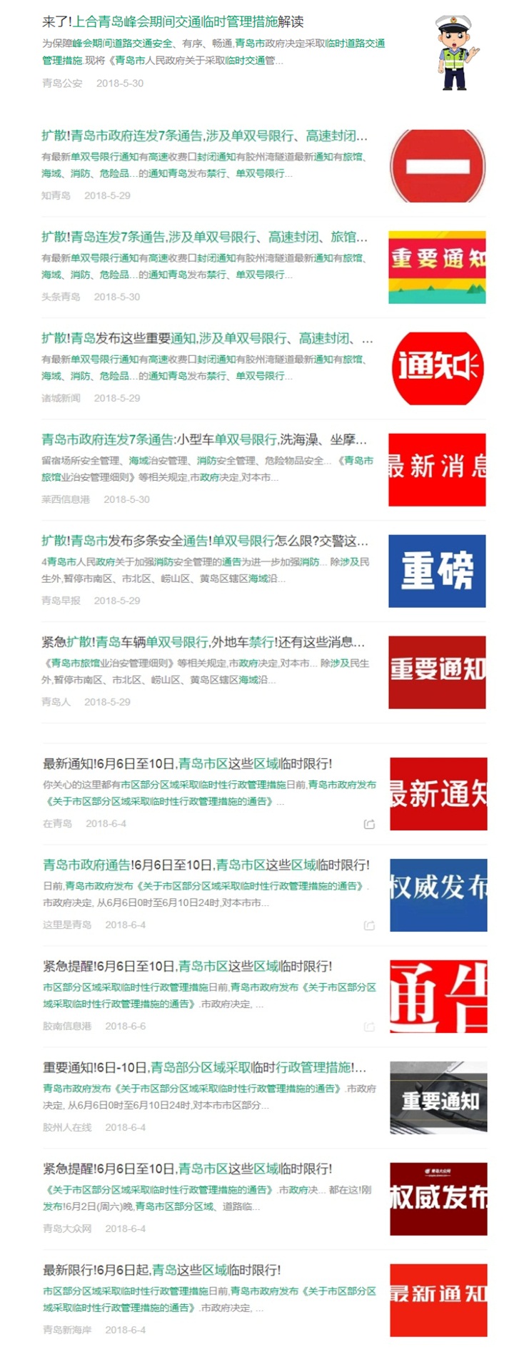 據(jù)清博后臺統(tǒng)計(jì),在峰會(huì)10萬+爆文中,關(guān)于交通信息爆文占據(jù)14篇。便民信息刷爆青島市民朋友圈,既為大家出行提供便利,也保障了峰會(huì)期間交通順暢。
