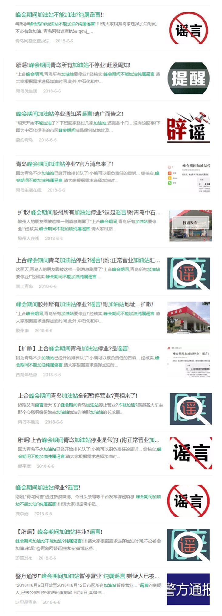 6月5日,某微信公眾號編造發(fā)布“2018年6月6日開始至2018年6月12日市區(qū)所有加油站暫停營業(yè)“謠言,在社會(huì)上造成惡劣影響。“青島公安”、“青島網(wǎng)警巡查執(zhí)法”第一時(shí)間發(fā)布辟謠信息,各大自媒體平臺像青島優(yōu)生活、青島本地寶、青島生活在線、膠州人在線、膠州事、西海岸熱點(diǎn)、黃島印象等百余家自媒體紛紛響應(yīng),在各自平臺轉(zhuǎn)發(fā)辟謠,迅速遏制了謠言傳播,減少了不必要的恐慌,為峰會(huì)順利召開肅清了網(wǎng)絡(luò)環(huán)境。