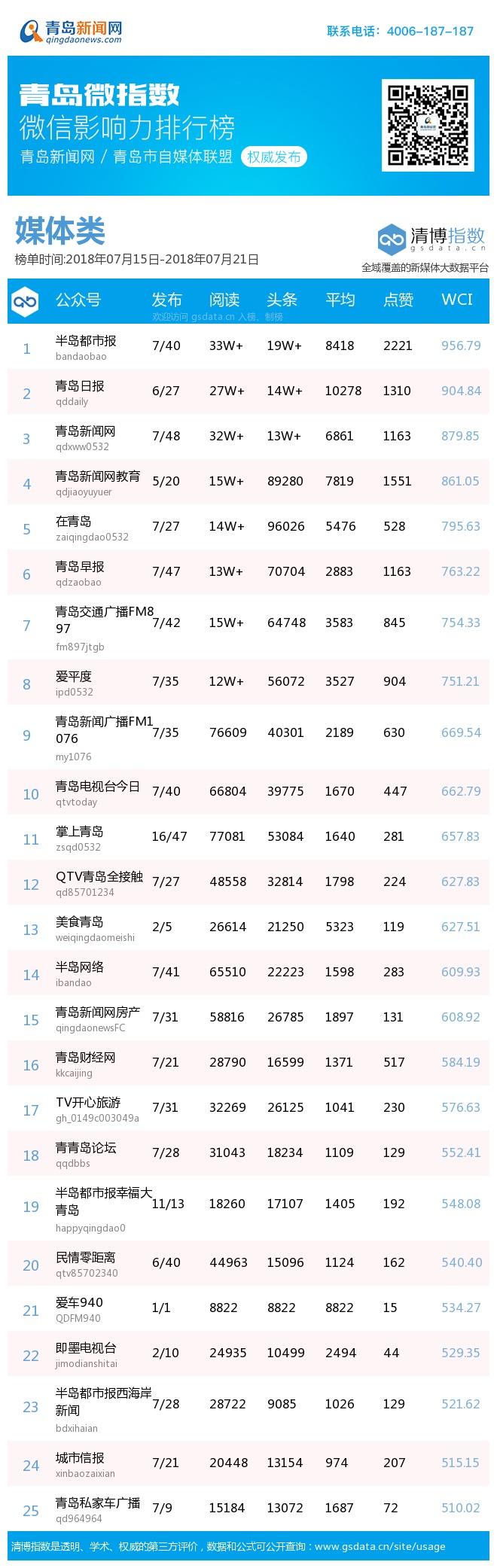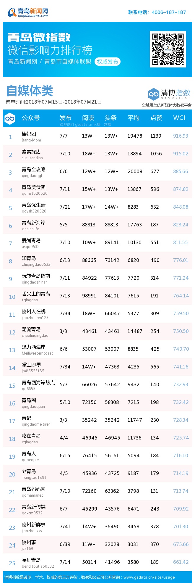 青島新聞網7月23日訊(記者 邢書玲)由青島新聞網、清博指數平臺聯手打造的“青島微指數微信影響力排行榜”今日發布一周(7.15—7.21)榜單。