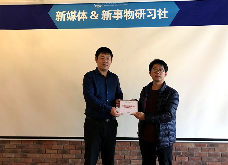 青島市自媒體聯(lián)盟為姚守欽頒發(fā)講師牌