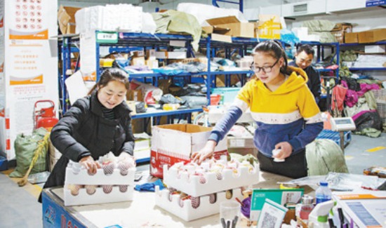 在四川阿壩藏族羌族自治州小金縣電子商務產業園內, 工作人員正在為電商平臺包裝商品。
