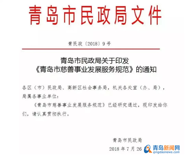 青島新聞網(wǎng) 6月10日訊 2018年7月26日,青島市民政局印發(fā)《青島市慈善事業(yè)發(fā)展服務(wù)規(guī)范》,這是國(guó)內(nèi)首個(gè)促進(jìn)慈善事業(yè)發(fā)展服務(wù)的標(biāo)準(zhǔn)化規(guī)范文件。一起來(lái)看看,規(guī)范中提到了哪些內(nèi)容。