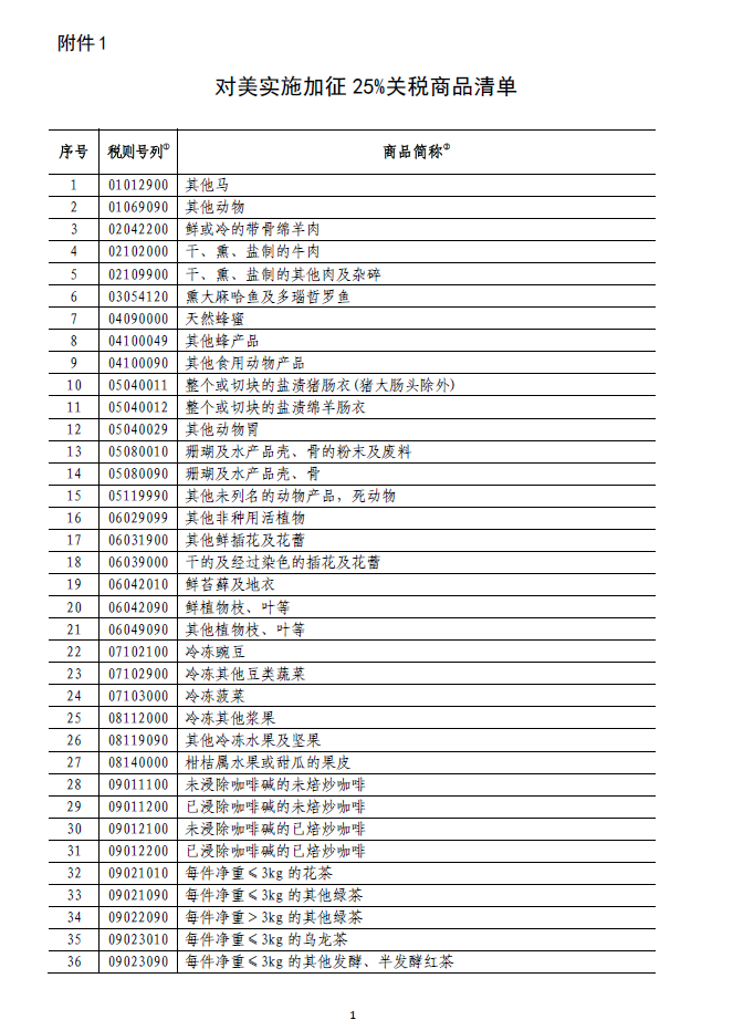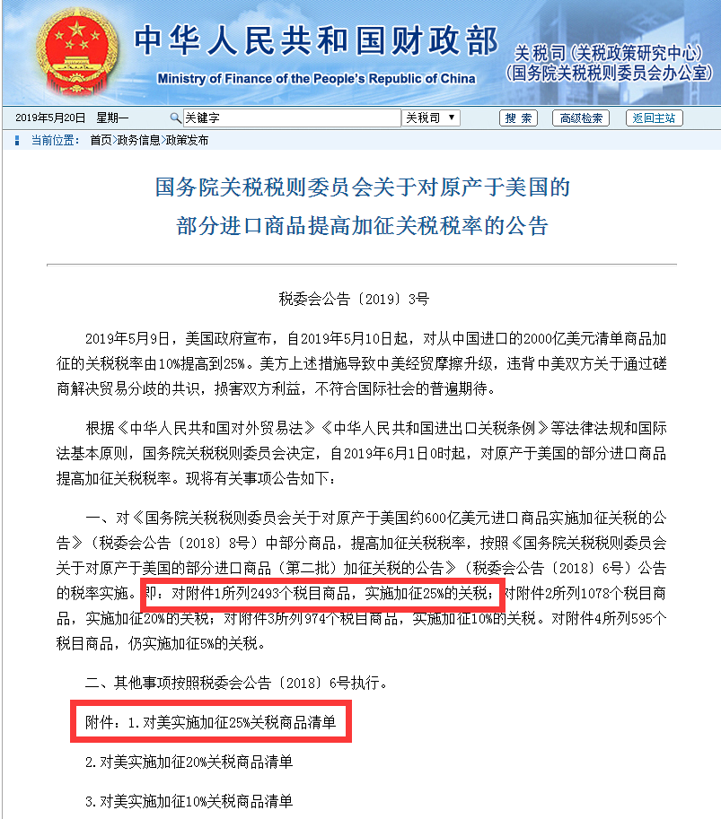查證發(fā)現(xiàn),國務院關稅稅則委員會5月13日發(fā)布對美商品加征關稅公告。公告稱,將對附件1中所列2493個商品加征25%的關稅(如下圖所示)。